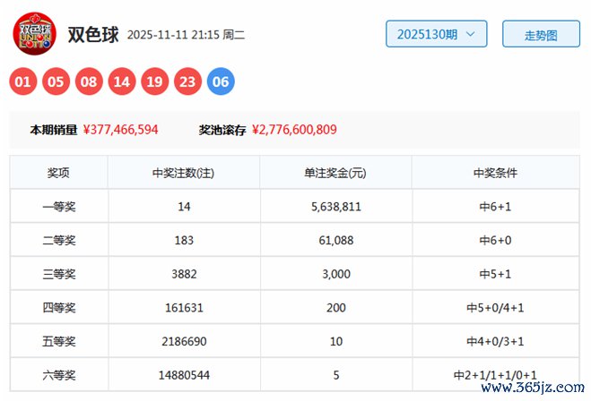 开奖转头:双色球第2025130期奖号为:01 05 08 14 19 23 + 06,其中红球号码奇偶比为4:2,大小比为2:4,012路比为0:2:4,三区比为3:2:1。